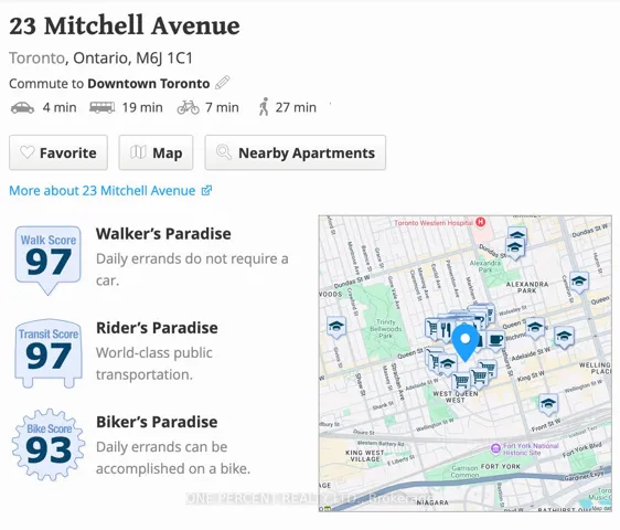 +"PublicRemarks": "Entire House for Rent. Welcome to 23 Mitchell Ave, a renovated detached home that offers a blend of modern design and functional living space. This two-story house, built in 2000 and renovated in 2025, sits on a 25x91 foot lot. It has 4 bedrooms and 3 full bathrooms, plus a main floor powder room. The kitchen is equipped with quartz countertops, a waterfall centre island, and high-end integrated and stainless steel appliances. The sunken living room is spacious, open, and overlooks the backyard. Throughout the main and upper floors, you'll find white oak engineered hardwood floors and LED pot lights. The home has 2,018 square feet of above-grade living space, with an additional 460 square foot lower level and 280 square foot garage. The lower level features a recreation room with heated floors and a walk-out to the backyard. A 3-piece bathroom was added to the lower level during the 2025 renovation, offering the potential for an in-law suite or fifth bedroom. Other features include a separate laundry room, built-in garage with interior access and private brick front pad, providing parking for two cars. Located in the vibrant Queen West neighbourhood, this property is close to many amenities, with an enviable Walk/Transit/Bike Score of97/97/93. Commuting is a breeze, with the Queen streetcar providing a quick and direct route to the financial district, Scotia Bank Arena and Rogers Centre. The King street car offers quick access to the Distillery District and Leslieville. Once the Ontario Line is complete, the King-Bathurst Station will be inclose proximity. Coffee shops and restaurants like Jimmy's Coffee and Terroni abound nearby. The home is also near parks, including Stanley Park and Trinity Bellwoods Park, which offer a range of recreational facilities. Venture south to find easy access to the lakefront. Offers anytime."