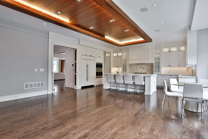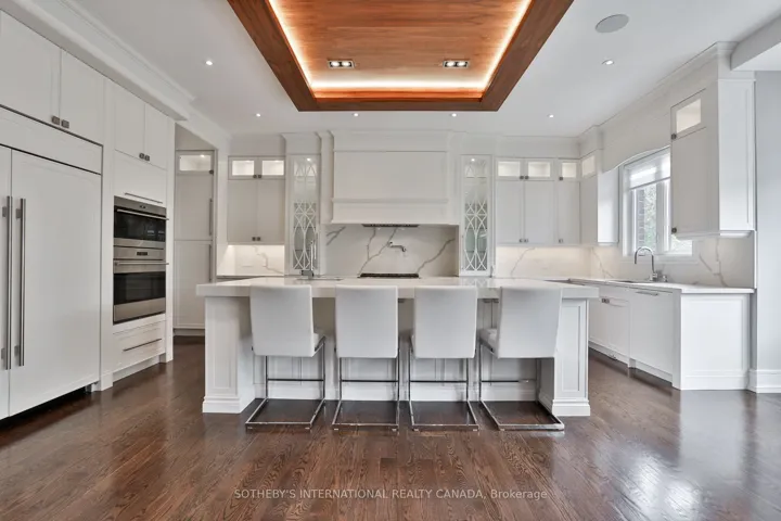+"PublicRemarks": "Welcome to this luxurious custom-built residence offering exceptional design, top-tier finishes, and an ideal layout for modern family living and entertaining. Located in a prestigious neighborhood, this home boasts just under 5,000 total square feet of luxurious living with 10' ceilings on main floor and over 11' ceilings in lower level. A must see spacious eat-in chefs kitchen featuring top-of-the-line Wolf appliances, ceasar stone countertops and backsplash, custom cabinetry, and an oversized island. The kitchen area is made for entertaining combining the breakfast area and family room with a walk-out to a large deck overlooking the professionally landscaped backyard Elegant hardwood flooring runs throughout the main floor, which also includes a formal living room, a generous dining room with walk-through access to the kitchen, and a private library/office. A grand staircase leads to the second floor with four bedrooms, each featuring high end ensuite bathrooms. The primary suite showcases designer decor, a custom walk-in closet, and a 6-piece spa-like ensuite with soaker tub, double sinks, towel warmer, and luxurious hotel like finishes. Enjoy the convenience of a second-floor laundry room equipped with a Samsung front-load washer and dryer. The fully finished lower level features heated flooring, a stylish wet bar, 5th bedroom with ensuite, and a walk-out to generous fully sodded and landscaped yard. A two-car garage with direct access into the home completes this exceptional offering. Don't miss this beauty!!"