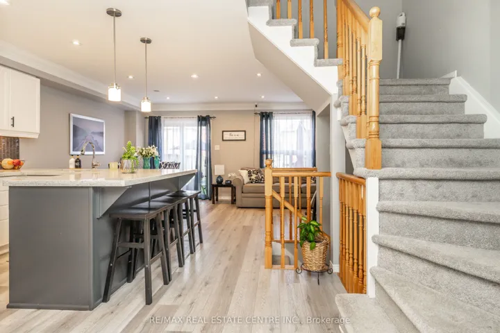 +"PublicRemarks": "Well Maintained & Upgraded All Brick Freehold Townhouse. Bright Open Concept Main Floor Living Area with Large Foyer & Double Coat Closet. Kitchen with Island Breakfast Bar, Pendant Lighting & Quartz Counter. Living & Dining Area with Large Window and Sliding Doors that Walk Out to Fenced Yard with Patio. Upper Level Offers Primary Bedroom with Semi Ensuite 4pc Bath. Plus Two More Good Size Bedrooms each with Dbl Closet & Large Window. Partially Finished Basement Rec Room, Playroom/Office, Laundry Rm & Storage. Good Size Backyard with Patio, Great Space to Unwind with the Family. Excellent Location, Easy Walk to Park, School & Downtown with All Amenities. New Laminate Flooring, Crown Molding, LED Light Fixtures & Paint 2023. New Furnace with Eco Thermostat, Central Air, Washer & Dryer in 2022. New Stove & Quartz Counter 2020."