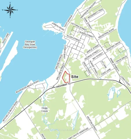 Draft site plan has been agreed to by the municipality for the construction of 86 units in 11 buildings as well as a common room/office building. Draft site plan approval is pending. The property is zoned Institutional, I-2, Independent Retirement residence which allows for a wide range of uses including senior citizens residence, and retirement rental units. Attached is also a planners opinion of other alternatives that may be possible on this unique site Over 10+ acres of vacant land located within the Victoria Harbour Settlement Area and 10km east of the Town of Midland. The building envelope is surrounded by mature forest including oak, maple and beech trees. The Tay Trail, scenic Victoria Harbour, public beaches, and Georgian Bay are within easy walking distance if the property. 7 minutes to Waubaushene and 12 minutes to beautiful Port Severn. Easy access to major arteries and amenities! **Please see the attachments with two separate potential concept plans for options and consideration. The only other form of residential development currently not provided is a single mid rise apartment building.**
