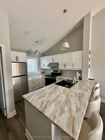 +"PublicRemarks": "Available for the ski season mid December to mid April, this two-bedroom, two-bathroom condo features a reverse floor plan. The entry is located on the second level, where you will find the bedrooms, a bathroom, and a laundry area. The upper level boasts an open-concept living, dining, and kitchen space with cathedral ceilings, creating an airy atmosphere. Additional amenities include a gas fireplace, a storage/pantry area adjacent to the kitchen, and a two-piece bathroom. The condo has been tastefully remodeled and offers a view of Georgian Bay. Please note that all utilities are additional to the rental rate, and references are required. There is no landline, and pets and smoking are not permitted."