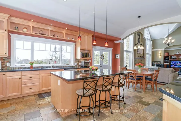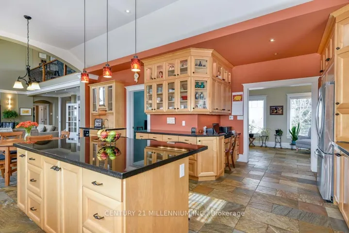+"PublicRemarks": "On a prestigious cul de sac, mins outside Alton & Orangeville, is this outstanding custom-designed 3+2 bed, 3.5 bath bungaloft with a finished walk-out bsmt in the French chateau style, with breathtaking views, both north and south, over the Caledon countryside. Sitting stately on the hillside w/ manicured grounds, this home features 4 fireplaces, multiple walkouts, a fenced dog run, a large wraparound deck w/ views of the private rear field w/ apple trees, and a 1+ acre pond. Bright & spacious 2-bed in-law suite has a 1-car attached garage (a rarity!), sep entry & a walk-out to a private patio w/ perennial garden. Extensive architectural qualities include elegant crown mouldings, bump-out niches & faux columns, pocket doors, arched hallways, strategically located pot lights, tray ceilings w/ ribbon lighting & quality materials such as cross-sawn oak floors thru/o. Dramatic Great room w/ soaring 19 ft. cathedral ceiling & stone-clad gas FP and mantle is open to the chefs Kitchen in natural maple wood w/ a large c-island w/ b-bar, granite c-tops, 12 ft. tray ceiling w/ lighting, SS appliances, a desk, wet bar, heated stone floors & a garden door to the deck w/ a gas BBQ hook-up. Primary has walk-in closet, gas FP, 5-piece ensuite w/ a glass shower & soaker tub. Laundry rm off the ensuite. Double French pocket doors on the main level offer privacy to the loft Office w/ a gas fireplace, built-in cabinetry & south-facing views. Lower level Rec rm has a garden door w/o to the b/yard. Rough-in 3-piece bath. Built in 2008, offering approx. 5100 sq.ft. of fin living space, 9 ft. ceilings on the main level, privacy, on 10.85 acres, while being close to Highways 10 and 9 for easy commuting, the hospital & Orangeville for all amenities. Near quaint restaurants, craft breweries, farmers markets, TPC Toronto Golf at Osprey Valley, Millcroft Inn & Spa, Hockley Valley Resort, hiking trails & conservation areas, and the Hill Academy. 45 mins to TO & Pearson Airport."