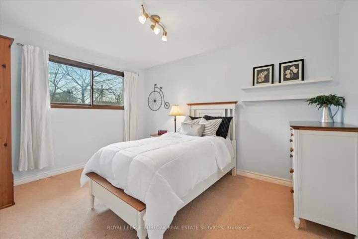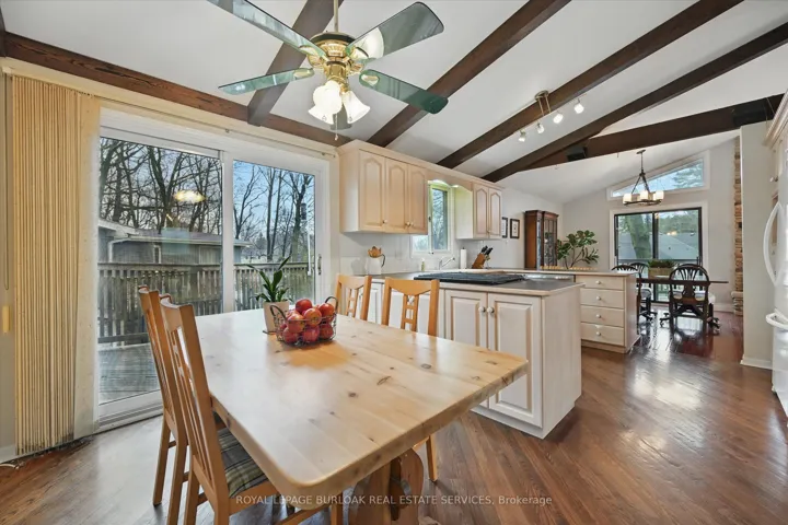 Enjoy a unique private cottage setting with all the amenities of city life nearby. Nestled in mature trees with an extra deep lot, this Aldershot home offers high ceilings on 2 floors and a bright, efficient design throughout. The double door entrance leads to a large foyer and main floor with exposed brick, vaulted beamed ceilings, oversized windows and a skylight. The open concept Living and Dining rooms feature gleaming hardwood floors and patio doors leading to a wrap-around multi-level deck. The Kitchen features storage and counter space galore with peninsula and separate breakfast bar area with more patio doors to the deck. The main floor Primary Bedroom features a 3-piece ensuite and oversized closet. Two additional Bedrooms and an updated 4-piece Bathroom complete this level. The Lower level features a spectacular Recreation room with a second fireplace and walkout to the back patio. A renovated 3-piece Bath, Office and Bedroom make it the perfect opportunity for additional family or guests. A separate Laundry room and Utility room with garage access offer even more storage space. With the Bruce Trail nearby and Lake Ontario steps away, this fabulous family home is a bird and nature lovers dream with walkable access to schools, parks, trails, golf, waterfront and shopping.