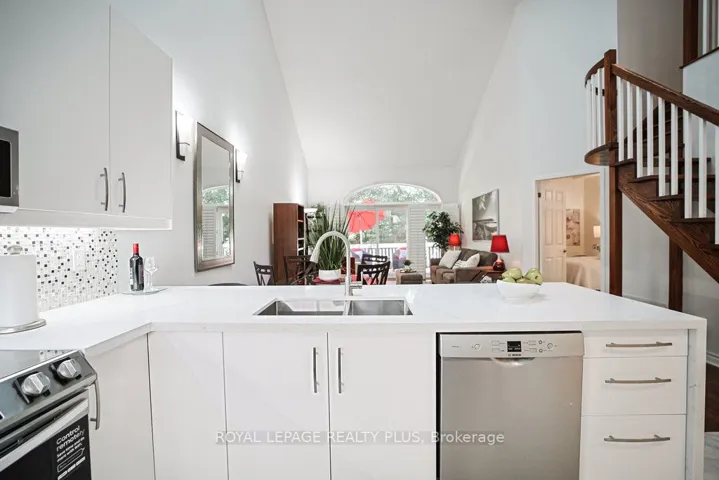 +"PublicRemarks": "MAIN FLOOR PRIMARY BEDROOM & ENSUITE - Renovated, Executive Townhome, rarely available Bungaloft with Main Floor Primary Bedroom & Ensuite. Nestled on a cull de sac in the private enclave of Turtle Creek, backing onto ravine. Just steps to Lake Ontario, nature trails & Jack Darling Park. This home backs onto mature combination of coniferous and evergreen trees, making for a most private & serene retreat. Inside the open concept layout features an impressive great room with soaring 23 foot vaulted ceilings, rich hardwood floors & a walk-out to a spacious deck overlooking the yard & mature trees. A beautiful renovated Kitchen boasts Carrara style quartz countertops with waterfall feature on the peninsula. Generous counter provides space for a breakfast bar or an awesome area for entertaining. Soft Close cabinets provide a choice of Pantry with slide out drawers, Pot Drawers, Tray Cupboards-Lazy Susan's, Room for everything! The PRIMARY BEDROOM, ON THE GROUND LEVEL, overlooks the natural greenery from the picture window, complete with renovated washroom with oversized shower, and sooo much closet space with built in cabinetry. The spacious 2nd bedroom also on the main floor, and with a vaulted ceiling, overlooks the garden & enjoys an oversize closet. The Loft boasts a relaxing sitting area overlooking the great room & includes a 3rd bedroom, complete with full washroom and walk-in closet. The lower level has a finished family room area with above grade window & corner fireplace. There is also a large unfinished area awaiting your imagination. There are laundry facilities on both lower level & the main floor. New windows throughout, New patio door-everything is ready Just move in. Conveniently located in the vibrant community of Clarkson and Port Credit. Enjoy the festivals, many restaurants & shopping. Easy access to Public Transit & Go train. The perfect combination of nature and urban living."