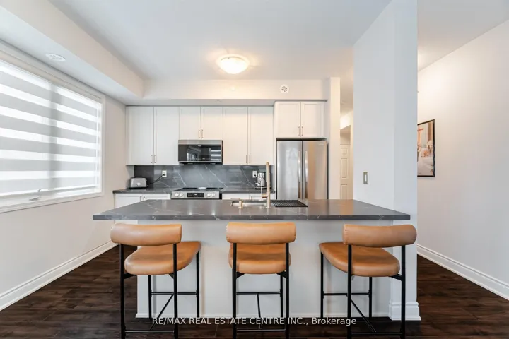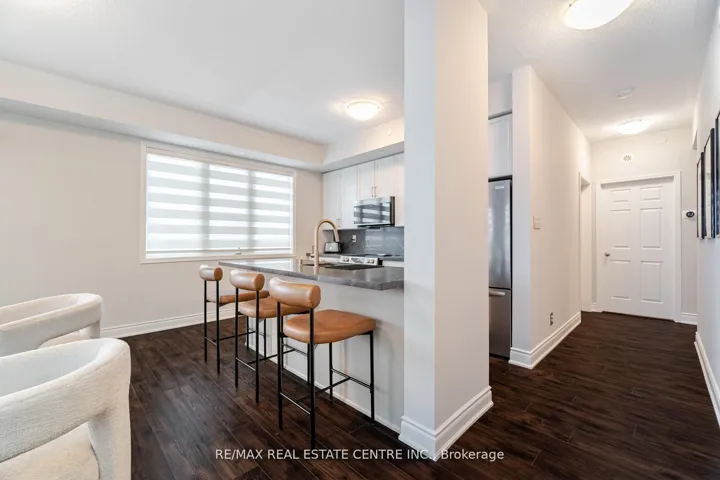 Upgraded, sun-filled corner unit in the heart of Churchill Meadows offering 751 sq. ft. of bright, open-concept living space with panoramic windows and 9-ft ceilings. The spacious living and dining area flows into a modern kitchen featuring a center island, quartz countertops and backsplash, an undermount Kraus sink with Kraus faucet, over-the-range microwave, and sleek cabinetry-perfect for casual dining or entertaining. This beautifully maintained unit also includes newer laminate flooring and baseboards, fresh paint, updated porcelain tiles in the bathroom, modern light fixtures, and two private balconies accessible from both the living room and primary bedroom. Low maintenance fees and unbeatable convenience with easy access to public transit and major highways (403, 401 & QEW), plus close proximity to Credit Valley Hospital, top-rated schools, and parks-making it an ideal choice for families, professionals, or investors.