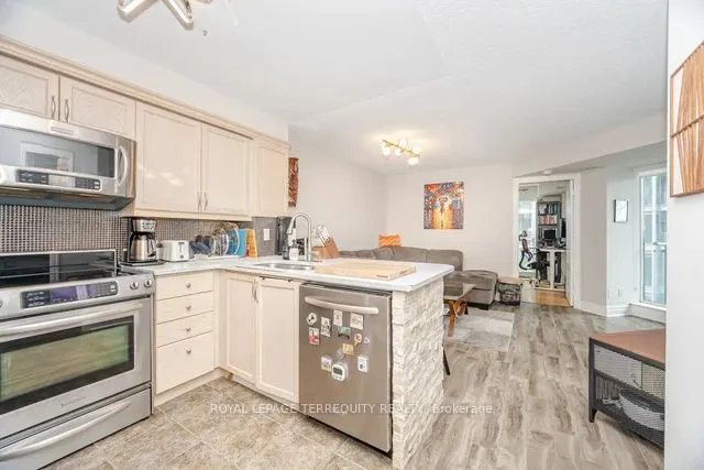 Experience exceptional living at The Voyager at Waterview, a prestigious waterfront condominium. This bright, spacious corner unit offers an open-concept layout with approximately 869 sq ft of living space, featuring 2 bedrooms, 2 full bathrooms, and a functional layout that maximizes natural light. Enjoy morning coffee or evening relaxation with two private balconies, offering quiet exposure overlooking a landscaped courtyard. Designer Kitchen: Features a counter top with a convenient breakfast bar, stainless steel appliances. Primary Bedroom offers access to the main balcony, two double closets with custom built-ins, and a 4-piece ensuite washroom. Resort-Style Amenities: Building amenities include a 24-hr concierge, indoor pool, exercise room, sauna, party room, theatre room, and guest suites with rooftop Sky Lounge to host your parties. Prime Location: Steps from the waterfront trails, Humber Bay Shores Park, cafes, restaurants, quick access to the TTC, GO Train, and downtown via the Gardiner Expressway and to Pearson international and Billy Bishop airports.