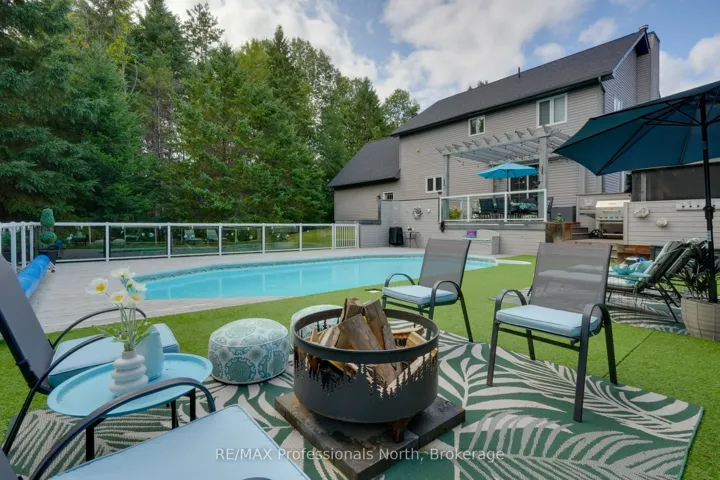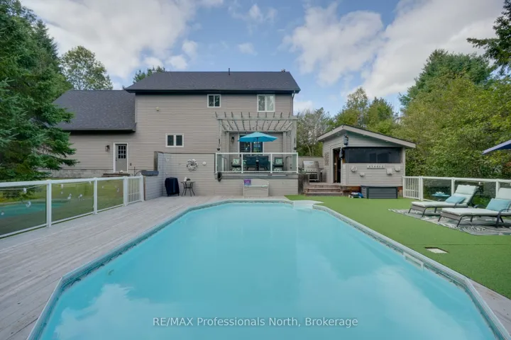 Welcome to Riverview Estates one of Huntsvilles most sought-after neighbourhoods, just minutes from downtown. Nestled alongside the Muskoka River, which connects Fairy Lake and Mary Lake, this community offers both convenience and a true Muskoka lifestyle. This charming two-storey, four-bedroom, four-bathroom home has been lovingly maintained and thoughtfully updated. A granite stone walkway leads to a spacious front porch the perfect spot for your morning coffee or evening unwind while watching deer wander by. Inside, the open-concept living and dining area is anchored by a stunning stone, wood-burning fireplace and hardwood flooring. The large kitchen is a true centerpiece, featuring brand-new quartz countertops, backsplash, and an island, gas oven and tons of storage and counter space. It overlooks a portion of the wooded backyard, bringing nature right into your cooking and dining experience. Upstairs, you’ll find three generous bedrooms, including a primary suite with ensuite bath – double sinks, plus an updated four-piece bathroom. All bathrooms have been refreshed with new flooring, vanities, countertops, sinks, and light fixtures. A brand-new finished basement adds even more living space, including a large recreation room, office area, bedroom, and full three-piece bathroom. Over the garage, a bonus recreation room with a cozy gas furnace, endless possibilities here for movie nights, playroom, or home office. Step outside to your private backyard oasis, featuring a pool with a brand-new heater, large deck, and screened-in shed ideal for entertaining or relaxing in total privacy. The sellers have invested in numerous upgrades for peace of mind, including: Hot water on demand Generac system (2024)New A/C (2023)New roof Brand-new pool heater Riverview Estates is a family- and pet-friendly neighbourhood with flat streets perfect for walking and biking, nearby boat launches, and 50 acres of hiking trails just across from Riverside Public School.