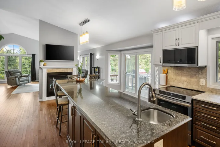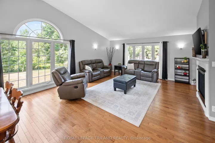 This is the one! Just 10 minutes from London, this stunning acreage with Wallace Creek running through it features a beautiful 4 bedroom raised bungalow with an oversized garage that easily fits two large pickup trucks, plus outdoor parking for an RV, 45ft trailer, and more. Blending modern upgrades, thoughtful design, and expansive living, its amazing inside and out. The home is warm and inviting with vaulted ceilings, open-concept layout, oversized windows, and hickory hardwood floors. A dual sided gas fireplace connects the great room and gourmet kitchen, which boasts a 12 ft quartz island, abundant cabinetry, and casual dining. Patio doors open to a large two tier deck and private yard, ideal for seamless indoor / outdoor living. All bedrooms fit king beds and include closet organizers. The main floor features two bedrooms, including a primary suite with two walk-ins and a spa like bath with double sinks and walk-in shower. Laundry/mud room and powder room complete the floor for easy one level living. The fully finished lower level offers a huge family room, two more bedrooms, full bath with tub/shower/double sinks, and a versatile workshop (pre-wired and plumbed for second kitchen to easily convert for an in-law suite). Direct stairs connect to the oversized insulated garage, perfect for car enthusiasts or hobbyists. Meticulously maintained with a new roof (2016), furnace, AC, and UV air disinfectant system (2017), ultraviolet disinfectant system for water, plus updated doors, custom lighting, and modern finishes. Central vac, gas BBQ line, two sheds, and negotiable zero-turn mower and snowblower add convenience. The sprawling lot offers privacy and mature landscaping, with low maintenance perennial gardens and a peaceful creek that attracts herons, deer, turtles, foxes, and more, your own private retreat. Just 3 minutes to Hwy 401 and under 30 minutes to Ingersoll, Dorchester, St. Thomas, and Aylmer, this exceptional home wont last.