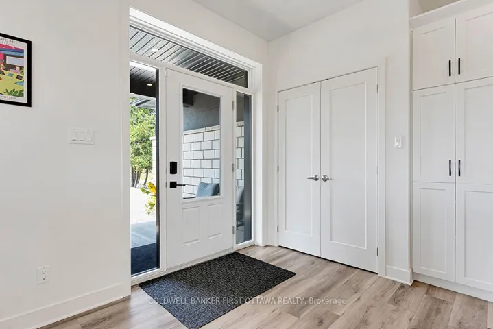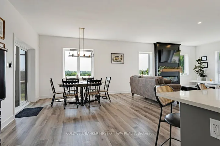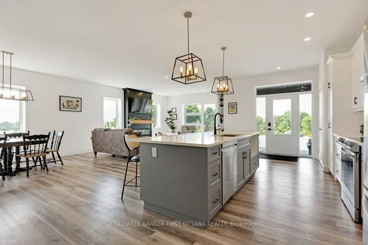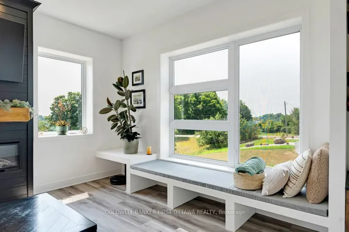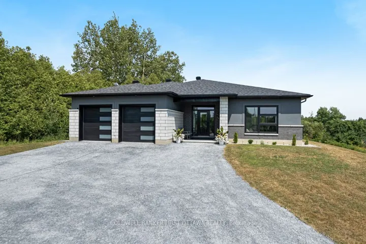 With eloquence on 2.7 acres, new 2023 bungalow is perfectly sited on knoll for sweeping panoramic views of the gentle countryside and magnificent sunrises. This energy-efficient ICF home also has attached double heated garage. Built by quality builder Hollington Homes, 3bed, 2 full bath home offers a sophisticated style with premium extras. Exterior Can Exel siding accented by attractive brick and stucco. Impressive front door framed by side glass panels and decorative transom creates light airy entry into foyer with convenient double closet. Luxury vinyl plank floors with radiant heating flow thru-out the home. Sun-filled living room has windows flanking modern Napoleon electric fireplace with log mantle; on other wall under large window is custom sitting bench with storage. Dining room patio doors open to expansive screened sunroom with ceramic floor and views of amazing vistas. Sparkling white bright kitchen has Cristallo quartz counters, textured subway backsplash, crown moulding and under cabinet lighting; the complementary two toned island-breakfast bar sits five comfortably. Mudroom has laundry centre with closet. Restful primary suite features patio doors to private covered patio with pot lights & ceramic floor, private retreat for quiet times. Primary suite also has walk-in combined closet-dressing room with wrap-about shelves and quartz make-up table. Ensuite consists of room with two vanities then, separate room for rain head shower with porcelain tile plus, a linen closet. Two more large bedrooms and 4-pc main bathroom with crystal reflection lighting. Home has heat pump for heating & cooling. Hot water on demand. Architectural roof shingles. Attached insulated double garage finished with drywall, pot lights and radiant wall heater. Lovely landscaped perennial gardens and mature apple grove. Home under Tarion warranty. Hi speed. Cell service. On paved township maintained road with mail delivery & school bus pickup. 20 mins Perth or 12 mins Carleton Place.