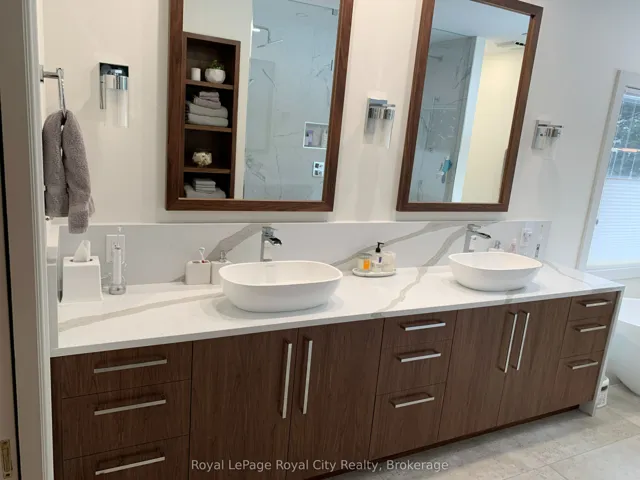 Set high on a hill and surrounded by mature trees and backing onto parkland, this extraordinary residence offers the ultimate in privacy & sophistication. A classic, timeless exterior, perfectly situated in Fox Run Estates, one of the area’s most coveted estate communities. Over 7300 sq ft of finished living space, it effortlessly blends elegance, comfort, design, and a touch of pizzazz. Magnificently located within minutes of all amenities as well as major transportation arteries, and yet a peaceful tranquil setting. Step inside and prepare to be impressed. The grand foyer boasting rich walnut flooring is flanked by a handsome home office on one side and an elegant formal dining room on the other – perfect for hosting special occasions. The private primary wing is a true retreat, complete with a newly renovated spa-like ensuite, a custom walk-in closet with Birdseye Maple cabinetry, and a private deck leading to a hot tub – the perfect spot to unwind at day’s end. The state-of-the-art Downsview kitchen is a chef’s dream, featuring an enormous granite island and abundant workspace for multiple cooks to collaborate in style. The bright breakfast area enjoys scenic countryside views, while the adjacent 2 storey sitting area offers a sunny sanctuary. This wing also provides access to a private front courtyard, a second main-floor powder room, laundry room and 3 car garage, along with convenient access to the rear yard and pool area. At the heart of the home, the family room is defined by a granite faced gas fireplace. Custom cabinetry houses an entertainment centre and French doors lead to an expansive rear deck overlooking the pool – a seamless blend of indoor and outdoor living. Upstairs, 2 bedrooms share a full Jack & Jill bath Third bedroom features its own private ensuite. Prepare to be dazzled once again on the lower level, where a recent renovation has transformed the space into an entertainer’s dream.