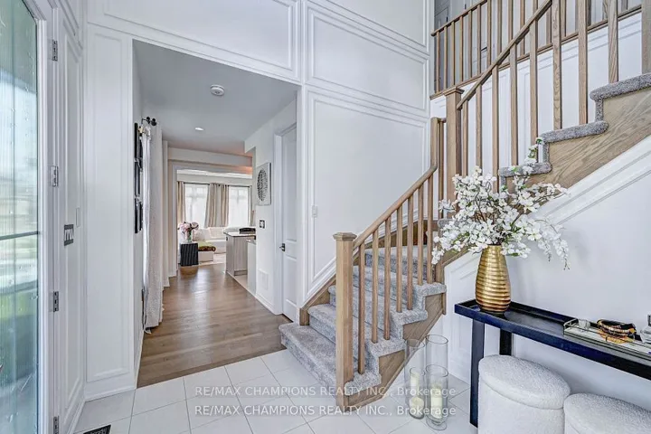 +"PublicRemarks": "This fully upgraded end-unit townhome sits on a massive corner lot. bathing the home in natural light through oversized windows. The open-concept main floor features 9' ceilings, 8'doors, wainscoting throughout, hardwood flooring, and a chef's kitchen with brand new Forno appliances, a wine cooler, and a large quartz island. The main floor office can easily serve as a fifth bedroom. Upstairs offers 4 spacious bedrooms, including a primary suite with walk-in closet and spa-like ensuite plus a convenient second-floor laundry. The garage is equipped with a 28-amp Tesla charger and the home is covered by 6-year Tarion warranty. Stylish sun-filled fully upgraded and set on a rare corner lot-this one won't last!"