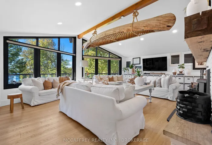 +"PublicRemarks": "Welcome to your private lakefront sanctuary - where elegance, scale, and serenity meet. Set on 3.8 acres of wooded privacy and boasting an impressive 259 feet of natural Beaver Lake shoreline, this extraordinary retreat offers over 5,000 square feet of finely renovated living space. Tucked into a tranquil bay, you'll enjoy peaceful waters free from heavy boat traffic, all while being part of a warm, welcoming community. A long circular driveway makes a grand approach, leading you to the homes timeless exterior and detached heated garage. Step inside and feel the airiness of soaring 12-foot cathedral ceilings, expansive windows, and wide-plank floors that capture every angle of the lake. The open living space blends comfort and sophistication, anchored by a cozy wood burning fireplace and panoramic water views. The chefs kitchen is a showpiece in itself, featuring a quartz waterfall island, built-in appliances, and seamless flow into the dining area. Open the 12-foot glass wall to step onto the deck -perfect for morning coffee among the trees or golden sunsets over the lake. With 6 bedrooms and 5 bathrooms, this home was designed for hosting family and guests in total comfort. The main-floor primary suite is a private retreat with a spa-inspired ensuite, soaker Jacuzzi, glass shower, and walkout to its own deck. Additional bedrooms, including a secondary ensuite, provide ample space for visitors. The walkout lower level expands the living space with a bright recreation room, office, second laundry, four additional bedrooms, a full bath, and generous storage. Step outside to your private waterfront oasis: a T-shaped dock for swimming and boating, a gazebo for shady afternoons, and a charming bunkie for weekend guests. This is more than a home - its an elevated lifestyle. Privacy, scale, modern design, and natural beauty come together in perfect harmony."